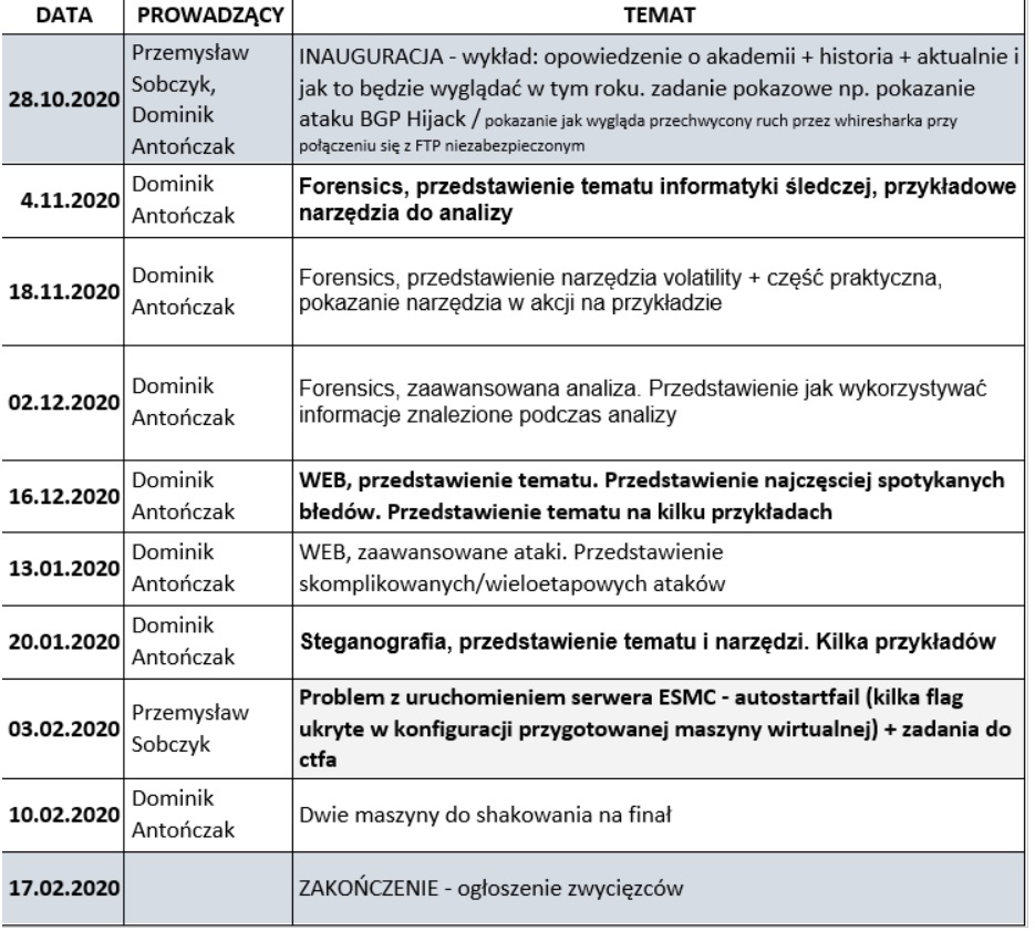 Tym razem FIRMA postawiła na rywalizacje między uczestnikami poprzez zadania w formule grab the flag, która umożliwia wytypowanie, a następnie wynagrodzenie najlepszych uczestników. W załączniku podaje plan akademii przekazany przez pracownika firmy PERCEPTUS plan
