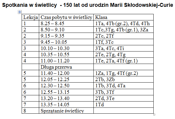 we wtorek 7 listopada, zostanie przeprowadzony wśród Was, szkolny konkurs z wiedzy o życiu Marii Skłodowskiej-Curie. W konkursie uczestniczą całe klasy. Przygotujcie się, będzie nagroda!