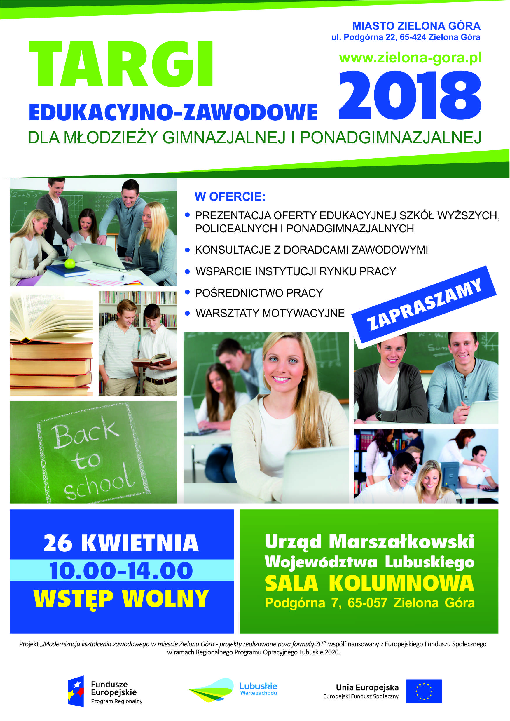 Miasto Zielona Góra zaprasza uczniów ze szkół gimnazjalnych oraz ponadgimnazjalnych do uczestnictwa w targach edukacyjno-zawodowych, które odbędą się 26 kwietnia w Sali Kolumnowej Urzędu Marszałkowskiego Województwa Lubuskiego w Zielonej Górze.